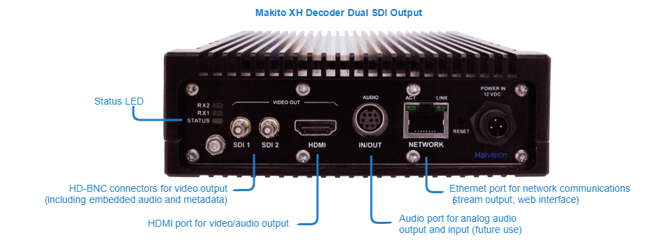 SDI Encoder Input: Connect the Makito XH’s SDI Video/Embedded Audio Input to your audio/video source(s) using the BNC connector(s) and coaxial cable(s).
