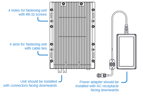 The chassis and power adapter must be positioned with the connectors facing downwards to minimize the possibility of water penetration.- Fasten the appliance to its support base with four screws (size 8-32, or 6 mm). Alternatively, you can use stainless steel, harsh-environment cable ties, which can be passed through slots in the chassis.