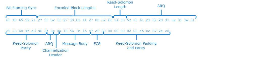 Note that due to the fact that the Reed-Solomon block size is 155 bits, which is 19.375 bytes, the coloring of individual bytes beyond the first block is approximate, as individual message bytes may contain bits from two separate layers. Individual codewords are not padded out to be an integer number of bytes; only the last codeword is padded so that the overall message occupies an integer number of bytes. This is why the actual message data in the above example is not recognizable as the ASCII string "hello".