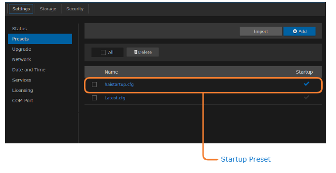 Configuration settings saved as the "startup" preset will continue to be used after a reboot, or when the unit is turned off and on. You can also direct the system to apply a preset to restore settings when the system startup process performs the configuration autoload.