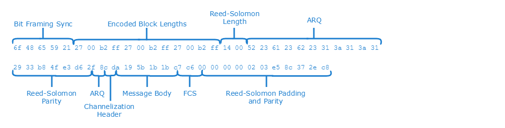 Note that due to the fact that the Reed-Solomon block size is 155 bits, which is 19.375 bytes, the coloring of individual bytes beyond the first block is approximate, as individual message bytes may contain bits from two separate layers. Individual codewords are not padded out to be an integer number of bytes; only the last codeword is padded so that the overall message occupies an integer number of bytes. This is why the actual message data in the above example is not recognizable as the ASCII string "hello".