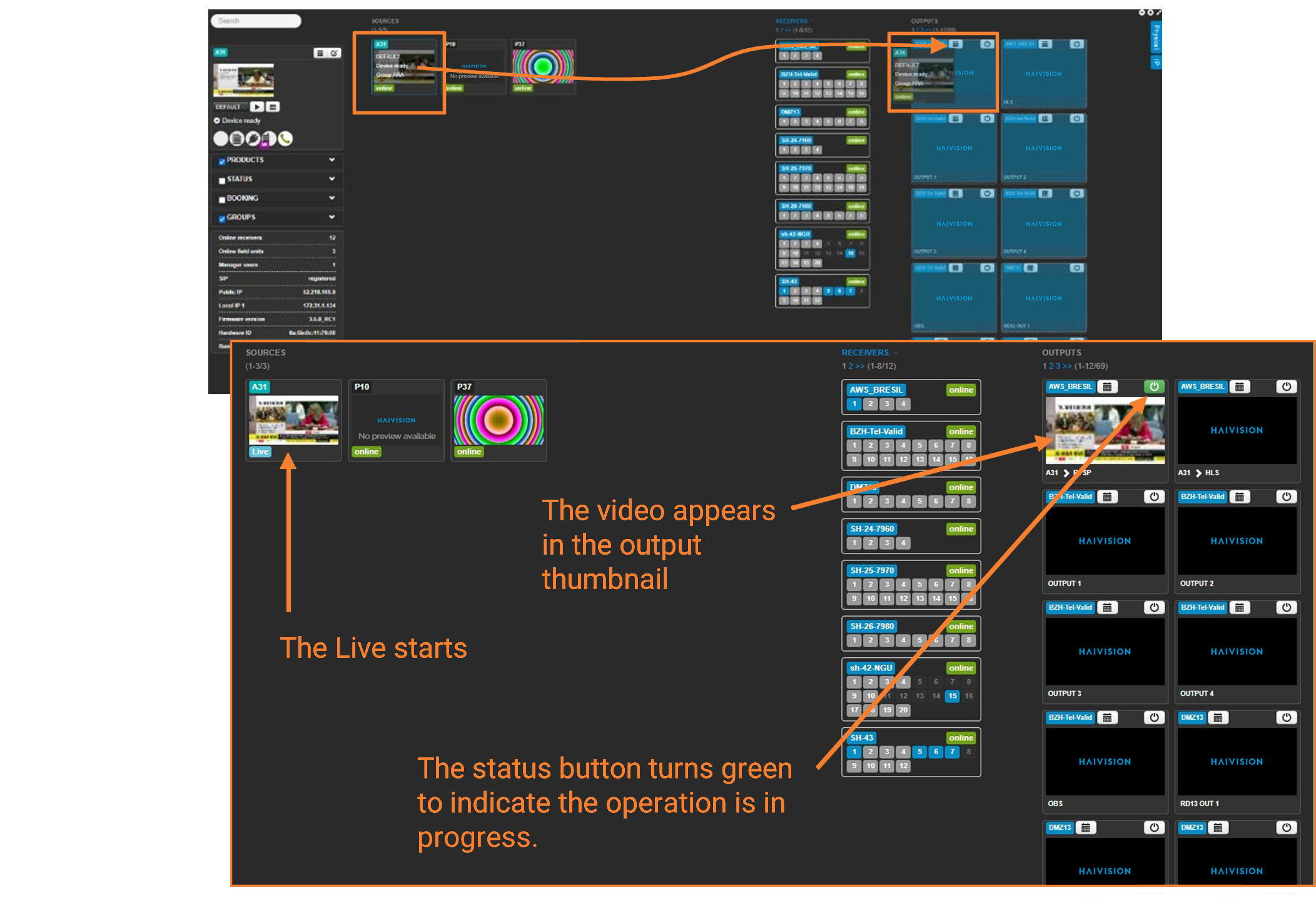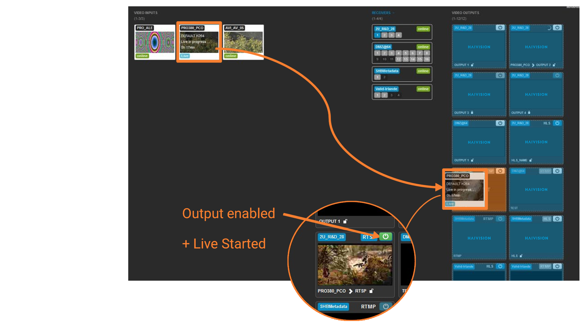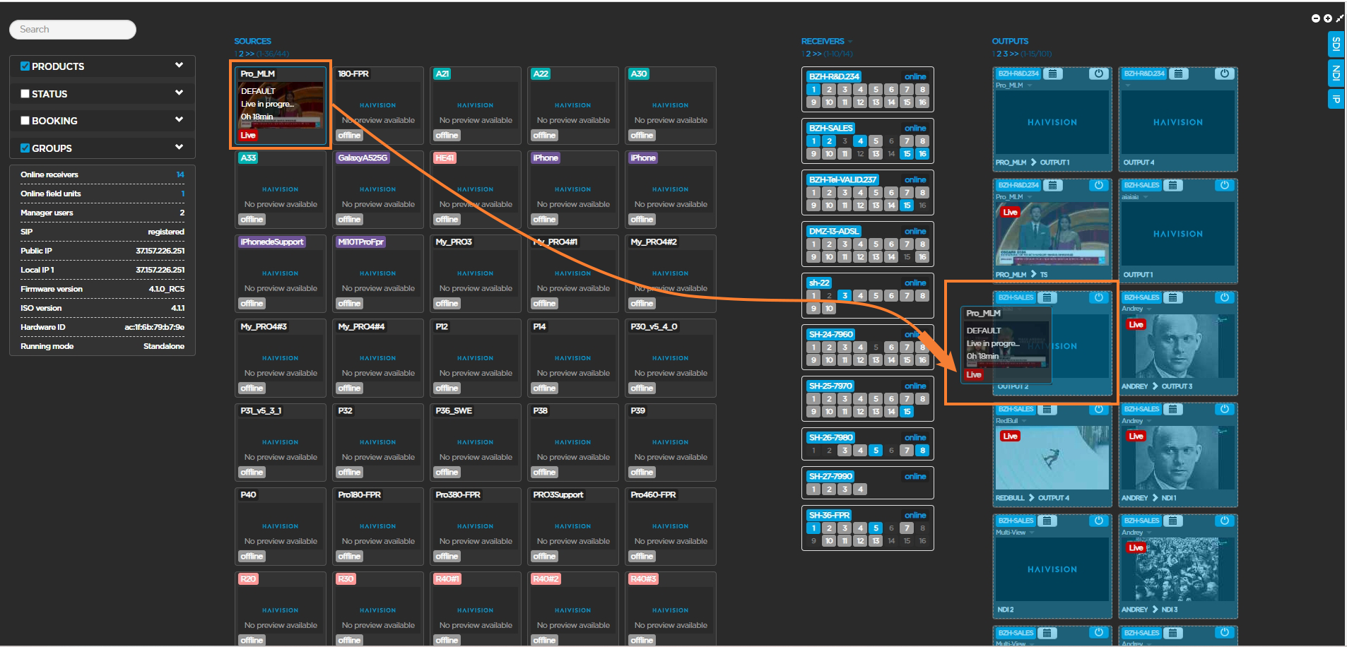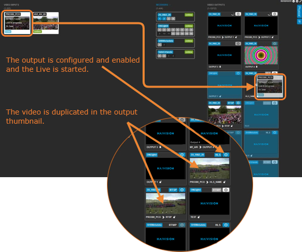 If an output was already assigned, and you drop the thumbnail onto another output, the video flow is duplicated onto the selected output.