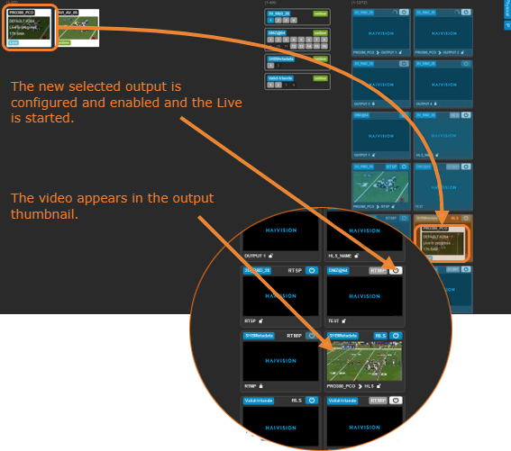 If no output was assigned for the live action in progress, the drag and drop action configures and enables the selected output.