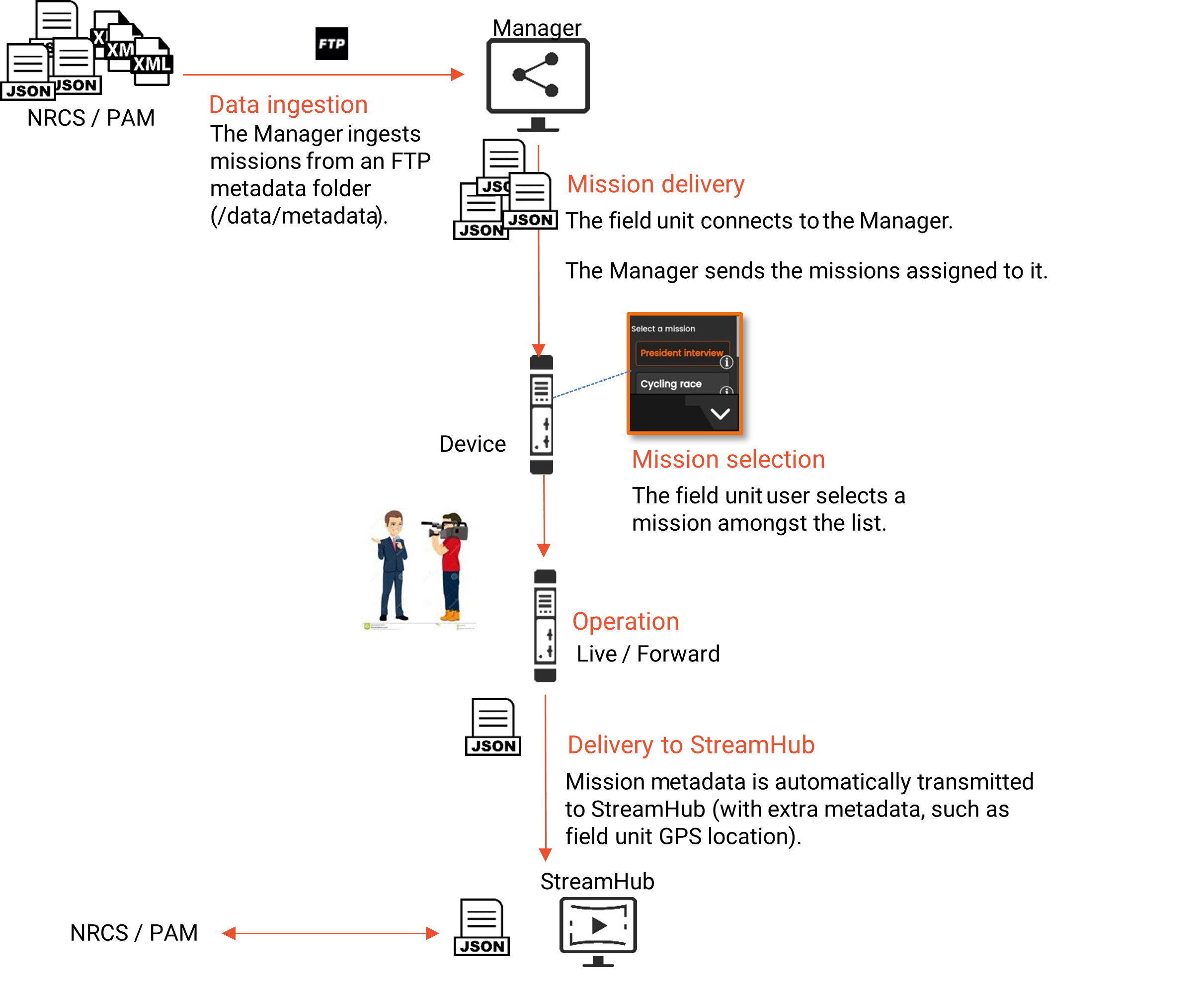 Via an FTP connection, it can ingest .xml or .json files containing data related to missions pushed by NRCS (News Room Computer System) or PAM (Program Asset Management) systems.