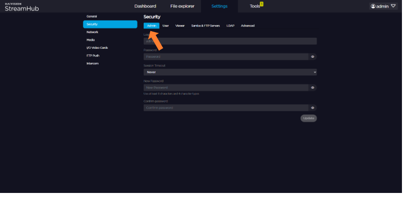 Under the Admin tab, enter:- the current Password- the New Password- the Confirm Password