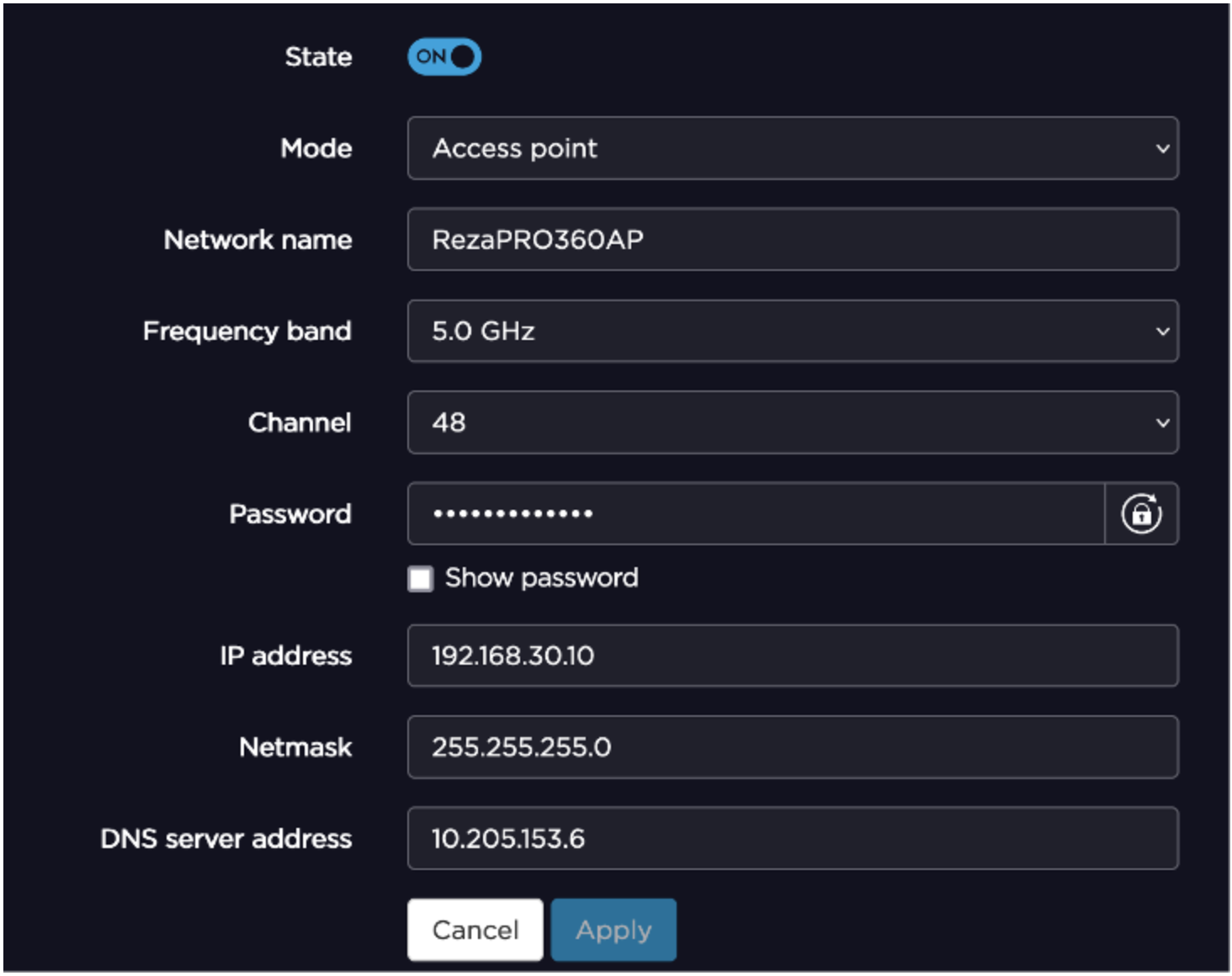 Be sure to record the SSID and Password so that they can be entered in the PTZ camera configuration to allow it to connect to this WiFi access point.