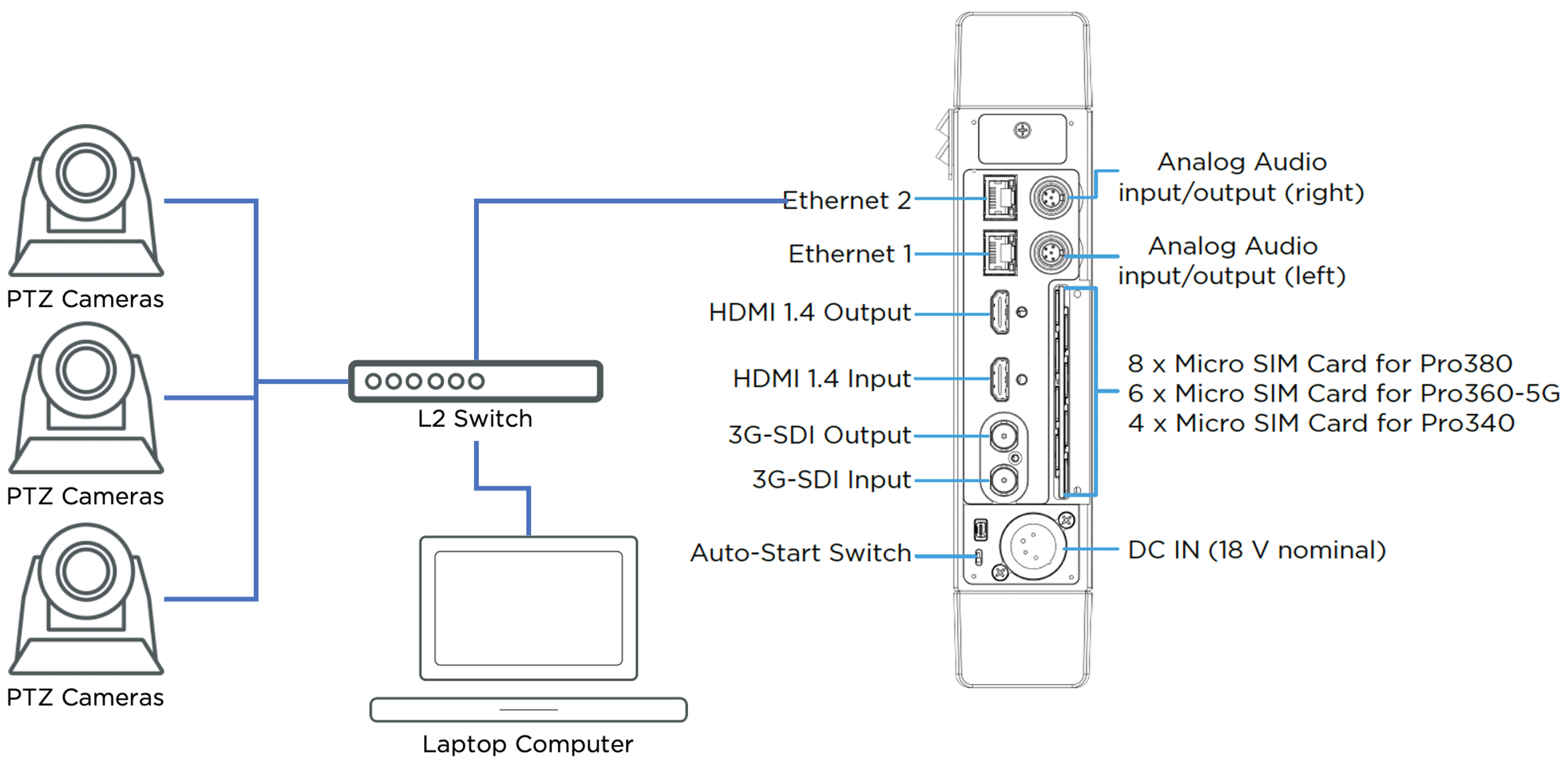 To allow communication between the field unit (transmitter) LAN and the StreamHub LAN, it is necessary to enable gateway / access point mode in the field unit (transmitter). This allows third party PTZ cameras to then be connected to the field unit (transmitter) LAN. There are two methods to achieve this:Method 1: Wired Mode