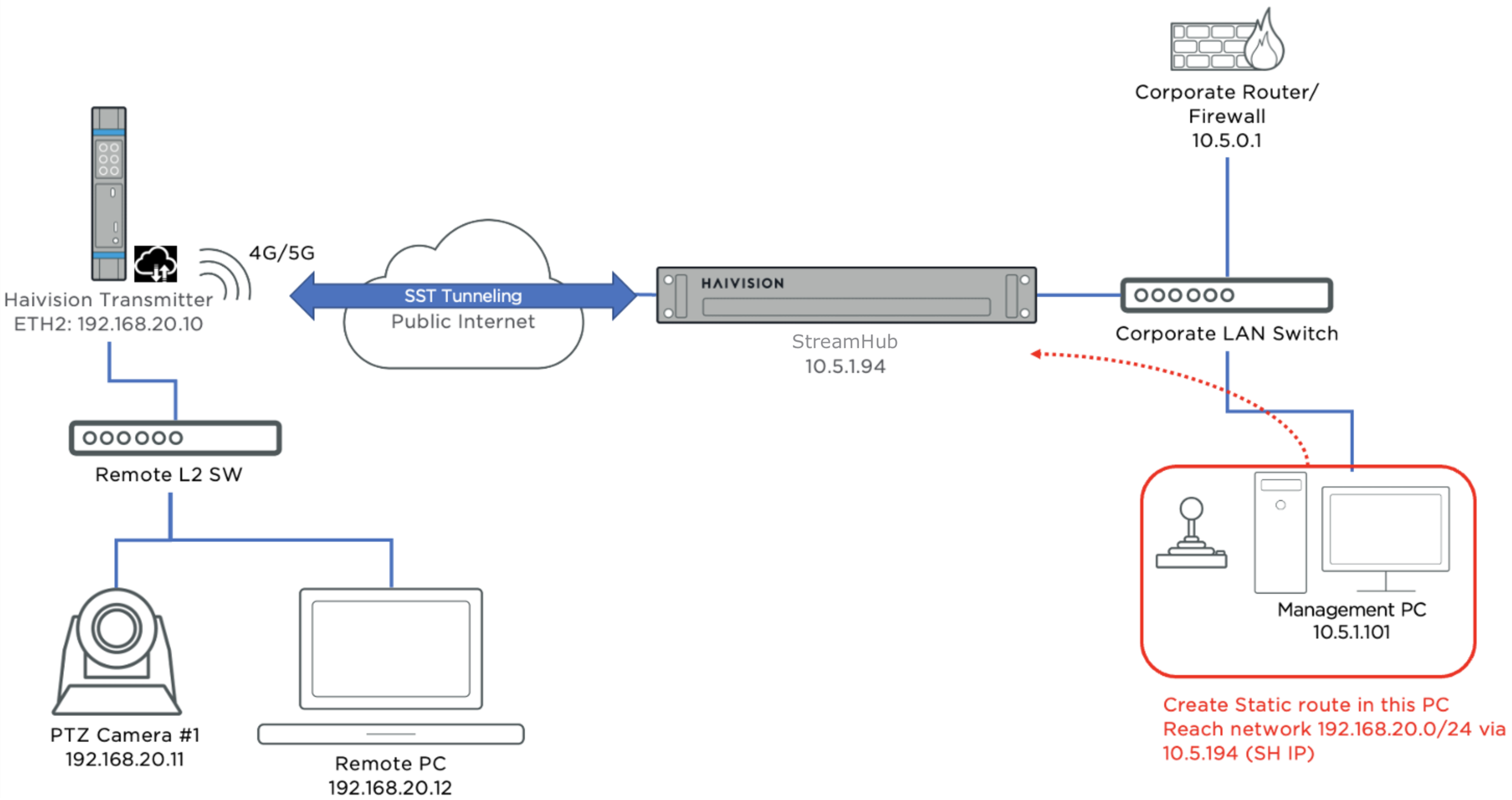 This step is necessary because the field unit (transmitter) LAN is only known to StreamHub. The StreamHub LAN typically connects to a router and the default route to the corporate LAN. The corporate LAN has no knowledge of the transmitter LAN connected to StreamHub.