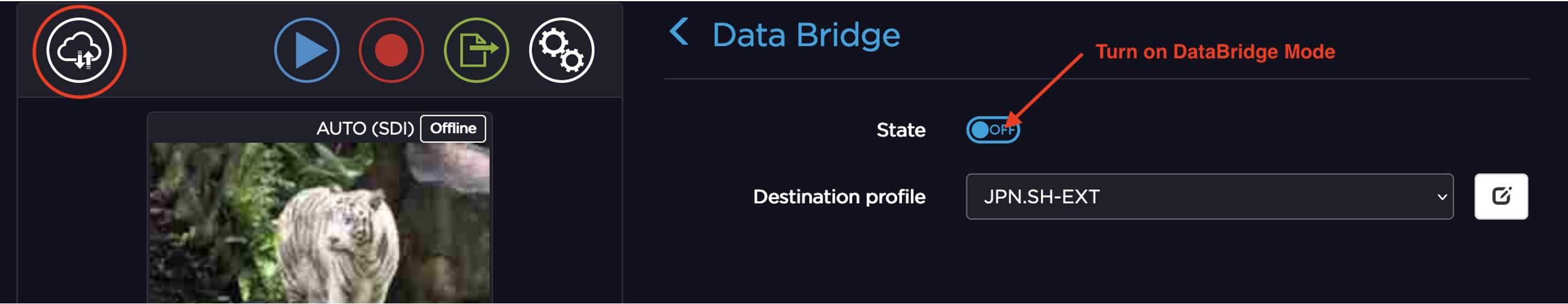 From the Web UI or the front panel, enable DataBridge mode on the transmitter, and then select the appropriate Destination profile (i.e. the StreamHub to connect with the DataBridge).