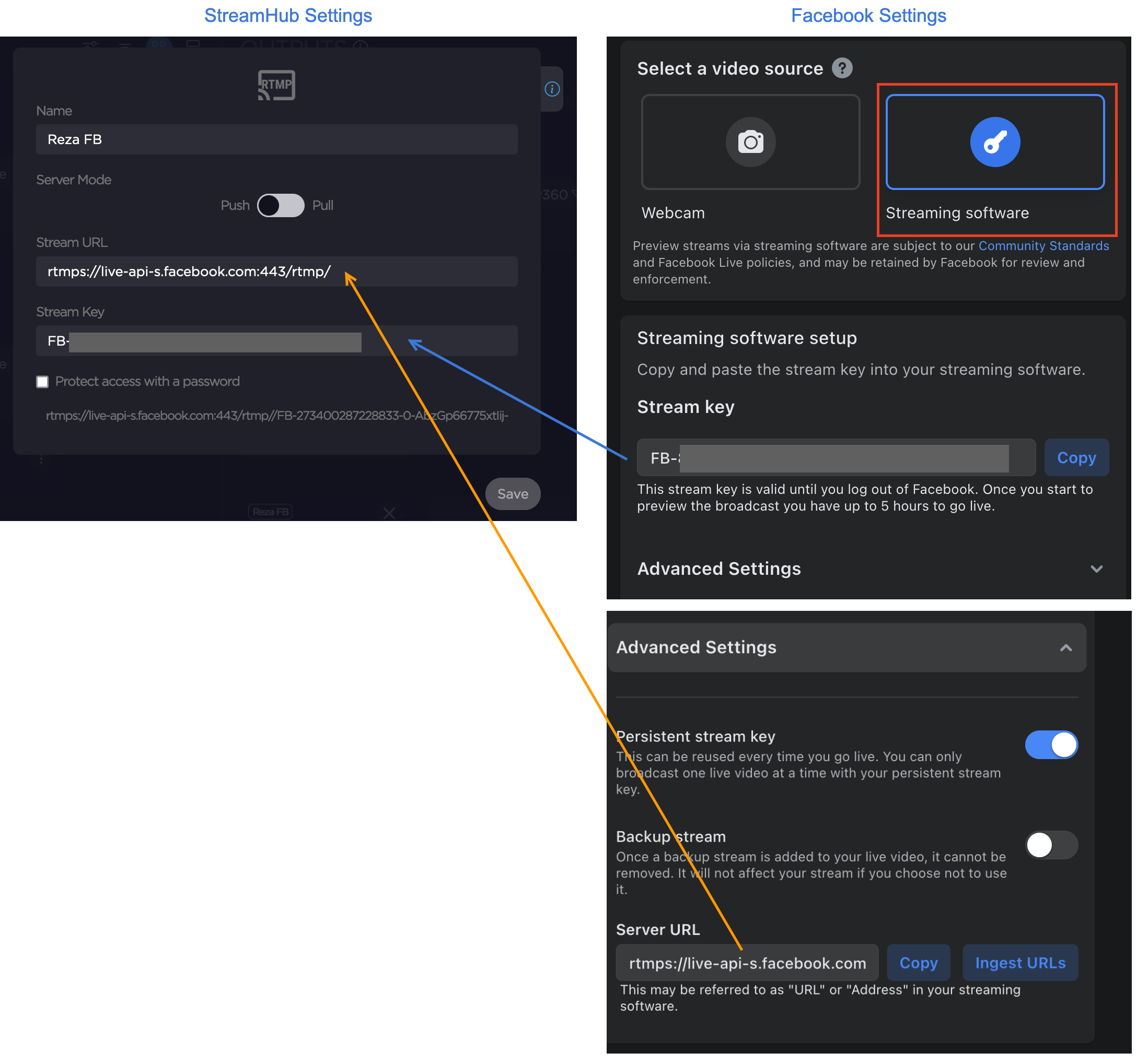 It is recommended to use Persistent Stream Key so that the Stream Key will not change and so the same key can be re-used in StreamHub.