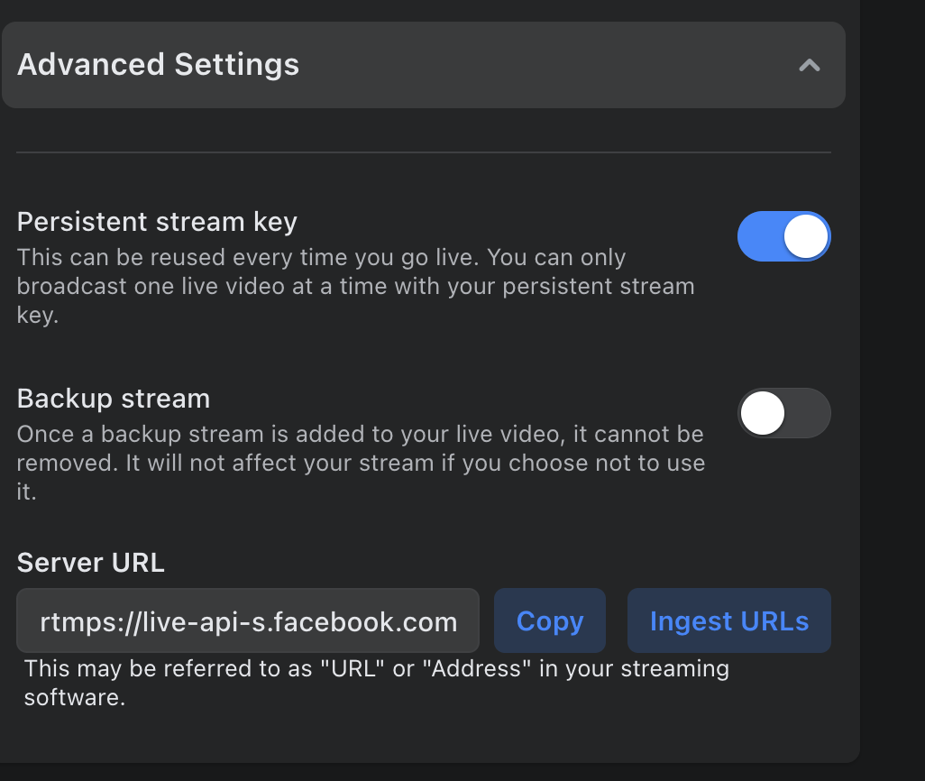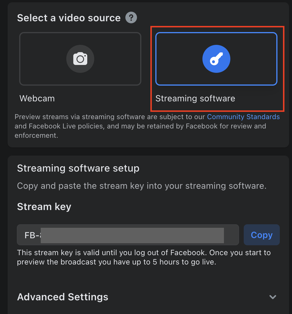 Select Streaming Software. The Stream Key and Streaming URL appear under Advanced Settings.