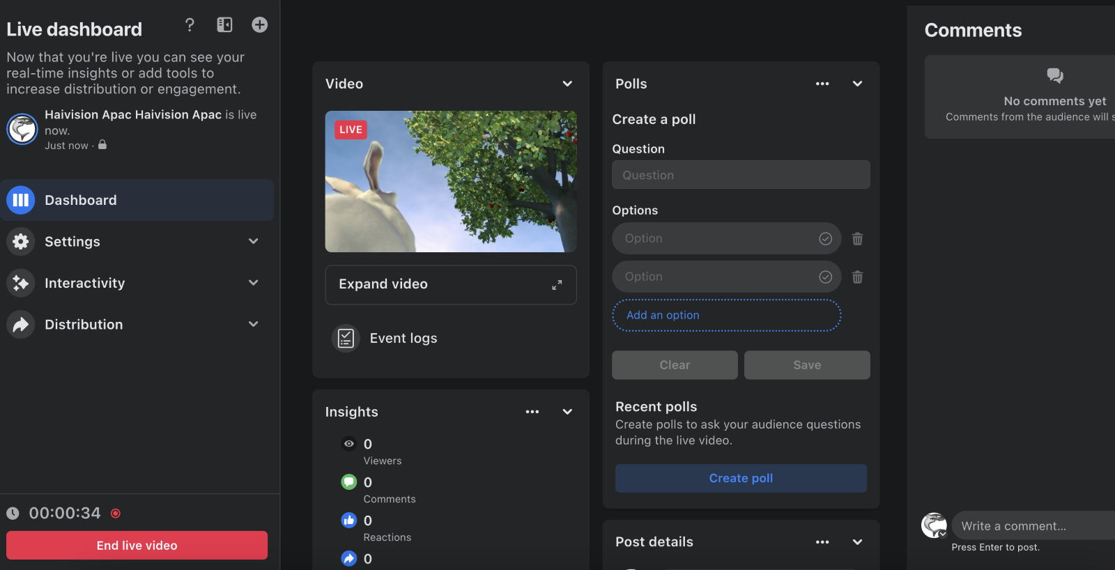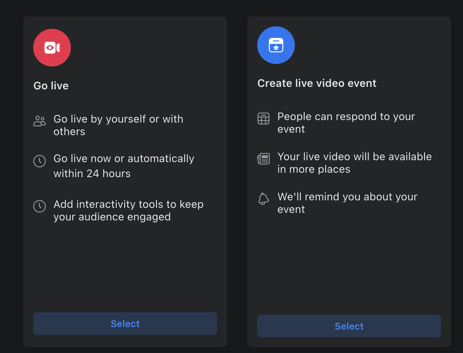 You may choose to go live now or schedule a live video event for later. Clicking Select for either option will open the Facebook Live Producer page.