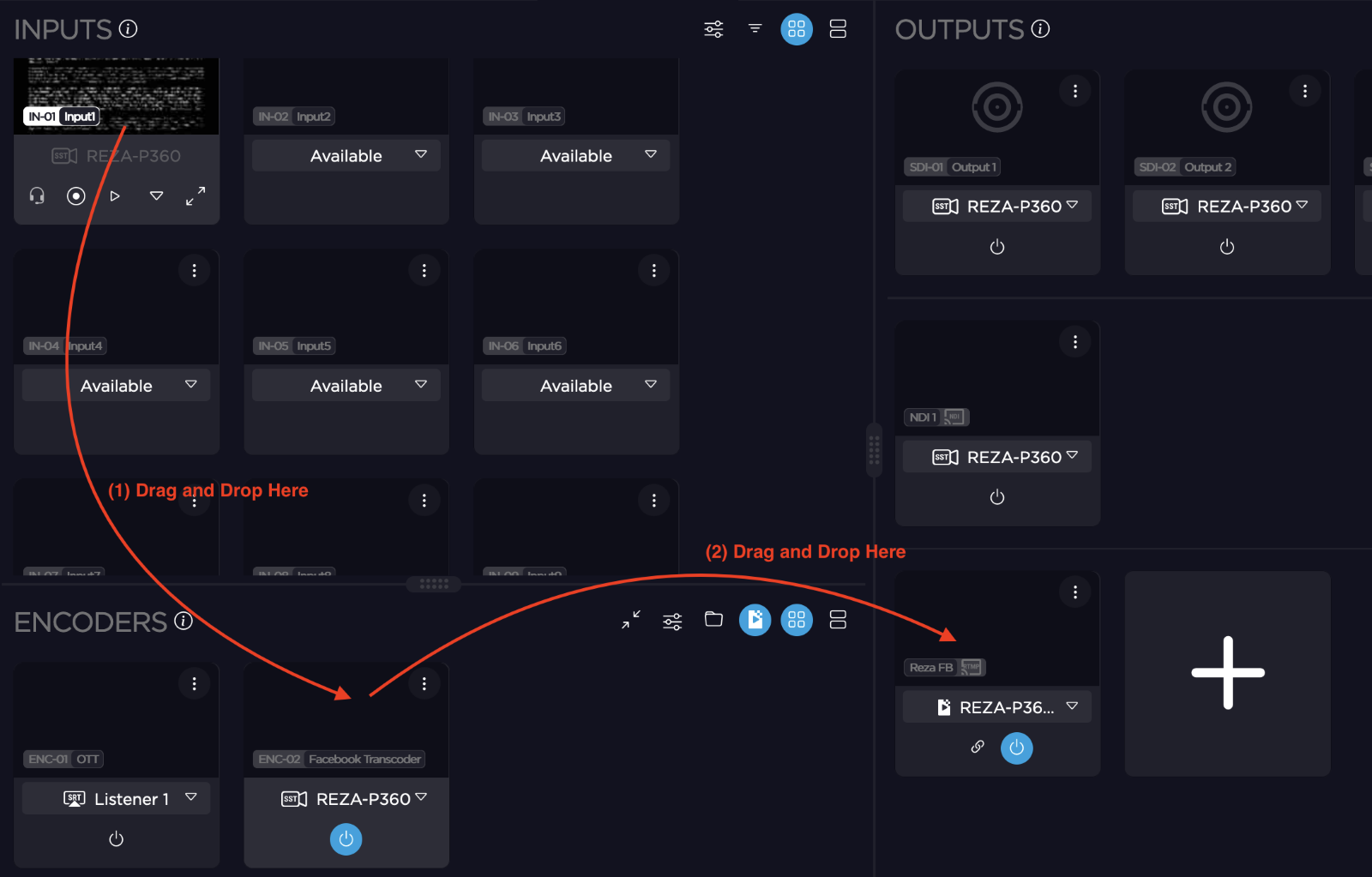 Method A: Drag and drop the desired input icon onto the Encoder, and then drag and drop the Encoder onto the Output icon.