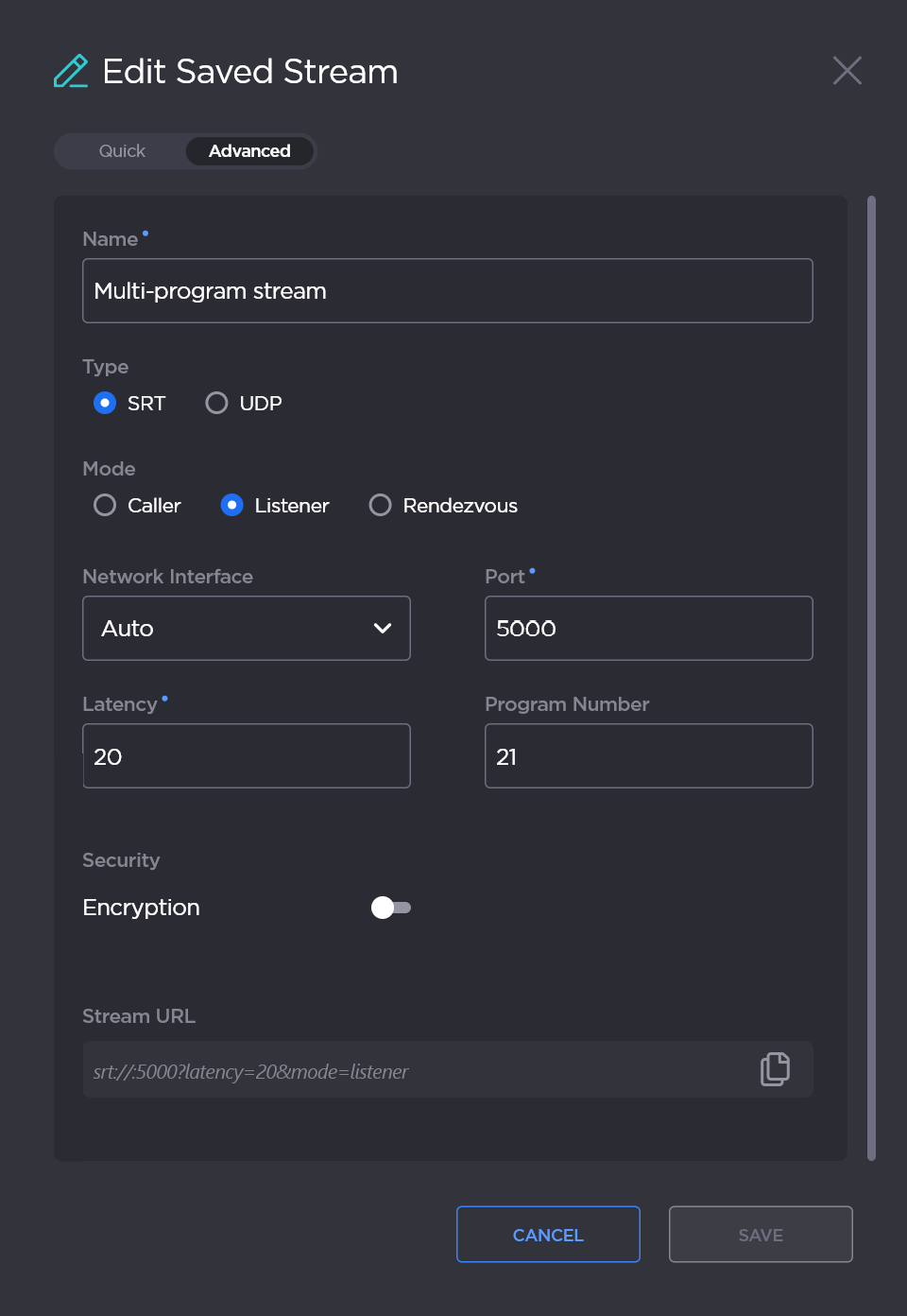 Click Edit to open the Edit Saved Stream panel and toggle to Advanced to make changes to the stream configuration. For configuration options, see Stream-Play Settings.