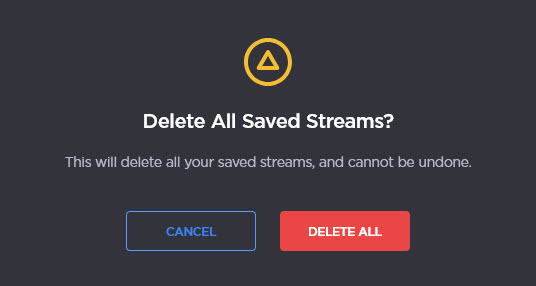 After clicking Delete All, a warning will appear asking for your confirmation to delete all streams. Click Delete All to confirm, or click Cancel to cancel this action.