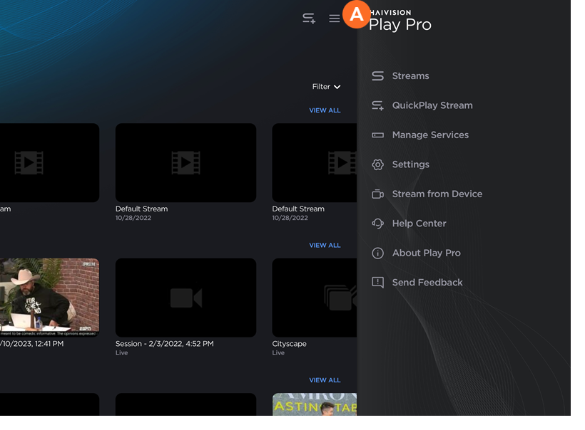 After signing in to Play Pro, you are taken to the Streams screen. From here, you can access the QuickPlay Stream shortcut, recently-opened streams, Local Lineups, and HMP services.