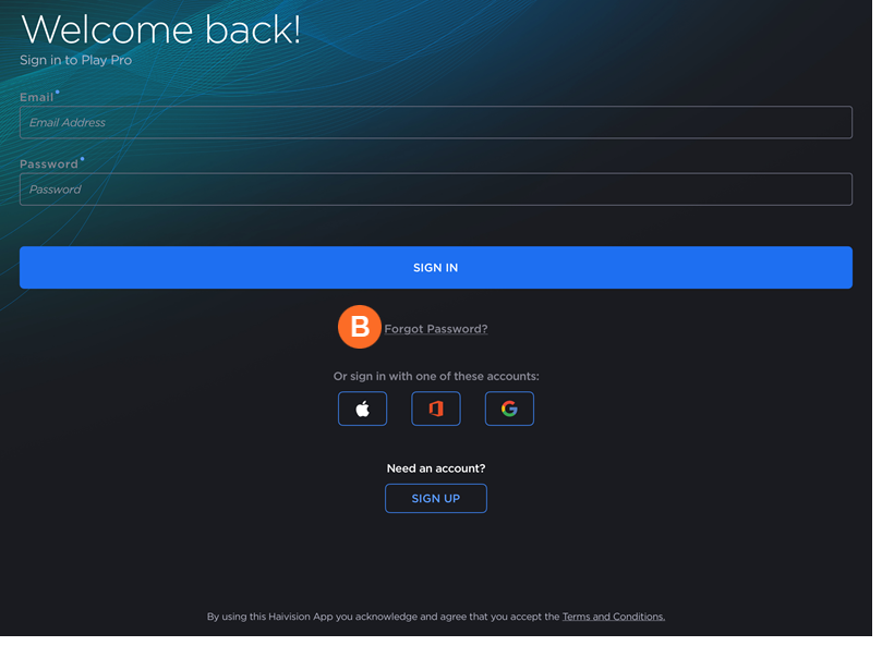The following instructions are for resetting the password to your account created for Play Pro and registered with Haivision. These instructions are not for resetting passwords for third-party accounts (Apple, Office 365, or Google), or HMP accounts. For help resetting the password for an HMP account, contact your administrator or refer to the HMP documentation.