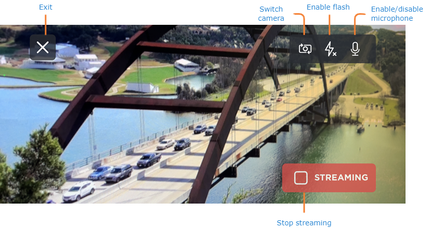 Selecting a channel from the Streams screen with the function set to Stream opens the standalone camera, as shown in the example below: