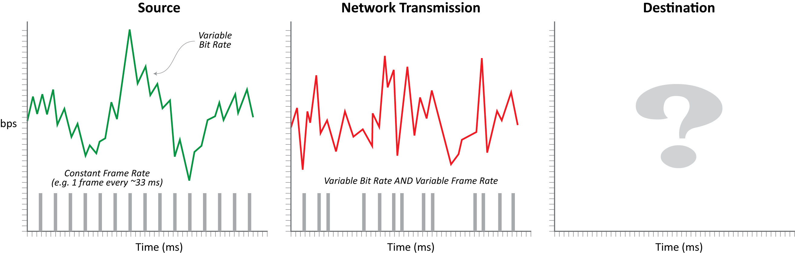 To achieve low latency streaming, SRT had to address timing issues. The characteristics of a stream from a source network are completely changed by transmission over the public internet, which introduces delays, jitter, and packet loss. This, in turn, leads to problems with decoding, as the audio and video decoders do not receive packets at the expected times. The use of large buffers helps, but latency is increased.