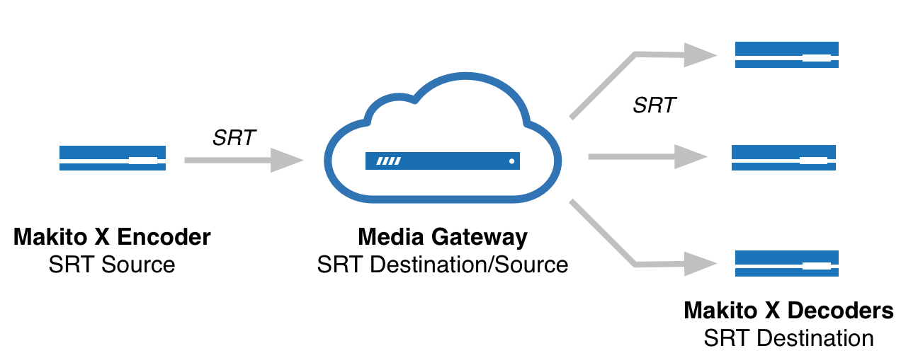 While SRT operates on point-to-point connections, Haivision's Media Gateway is designed to support multiple such connections. A single incoming SRT stream can be redistributed via one or more Media Gateways to multiple SRT destination devices.