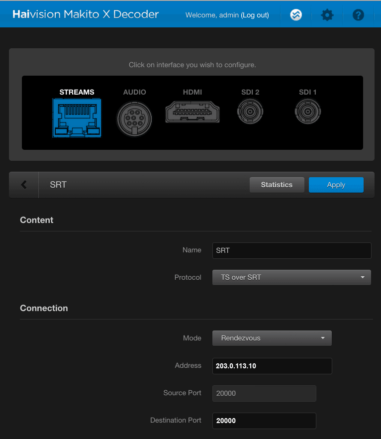 | Mode | Rendezvous | Makito X Decoder will attempt to initiate the SRT session, and listen for incoming SRT connection requests. |