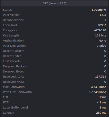 | ✓ | Peer Decryption | Indicates whether or not the SRT stream is being successfully decrypted. | |