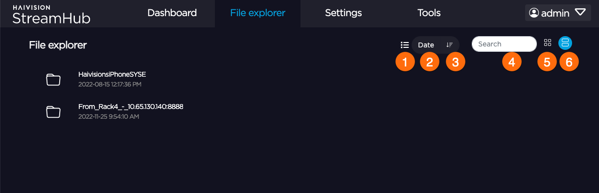 Multi-Selector Filename or Date Sort Toggle Sort Order ( ascending or descending) Search field Thumbnail view List view
