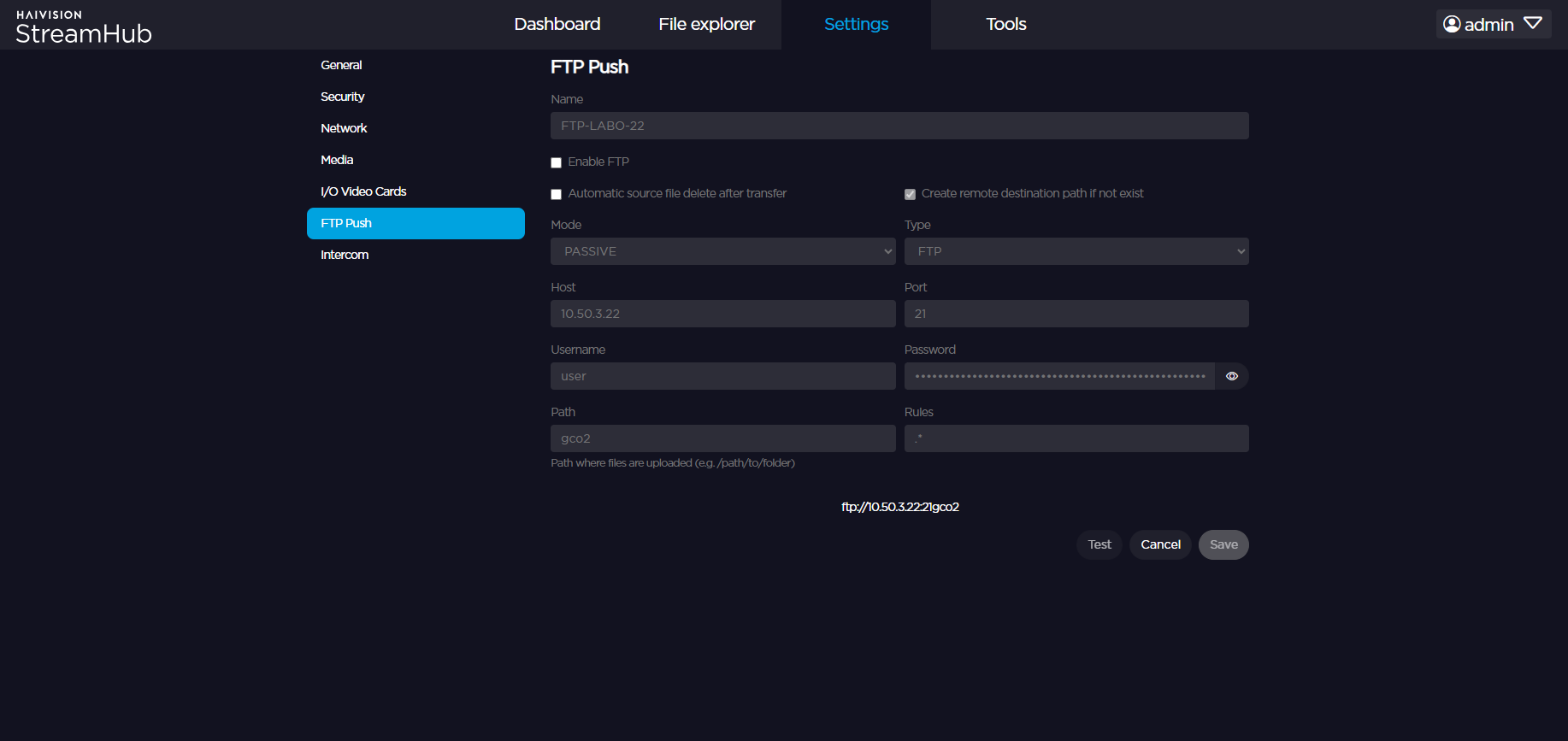 The FTP Push menu is set the StreamHub as a FTP client. See Configuring StreamHub as an FTP Client.