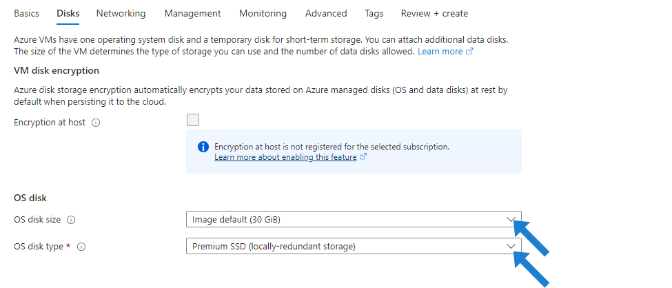 Under Disks, choose the OS disk size and OS disk type suited to your operational needs. Set Encryption if desired: