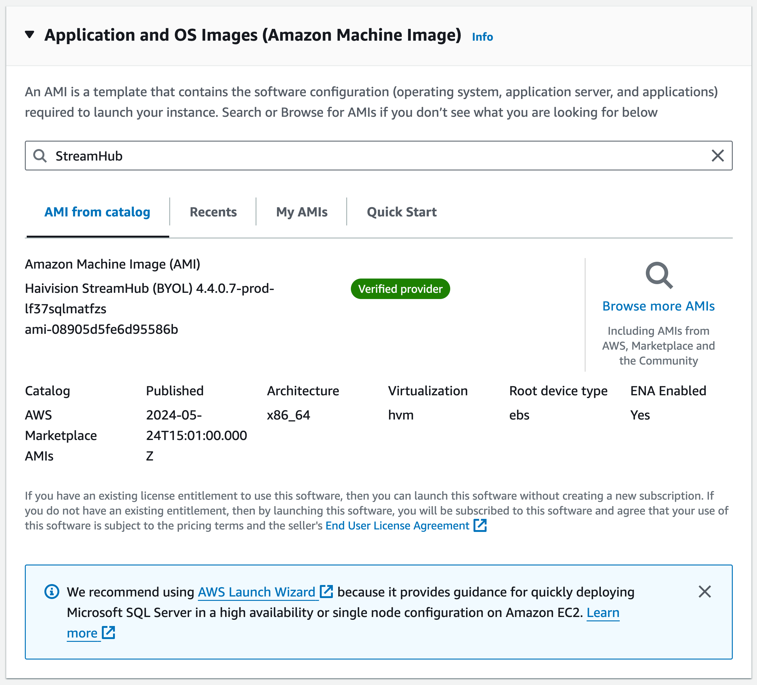 Type "StreamHub" in the search box and press Enter to find the version of the StreamHub Amazon Machine Image (AMI) you wish to use: