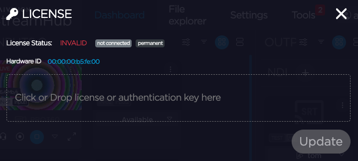 The License page appears. Before continuing to use your StreamHub server, you must obtain and apply a license. See Licensing Your Server.