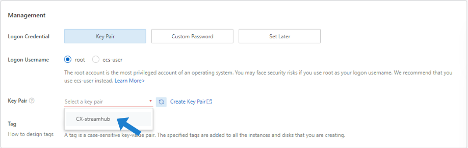 In the Management section, choose the newly created Key Pair: