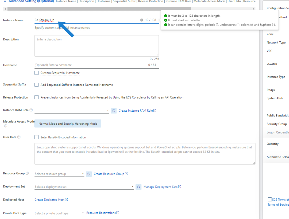 In the Advanced Settings section, enter an Instance Name: