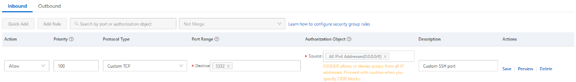 Click Add Rule and add new rule for SSH port 5322 (refer to theNetwork Port Requirements indications):
