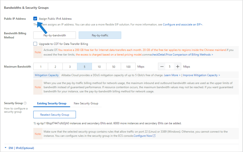 In the Bandwidths & Security Groups section, click Assign Public IPv4 Address.
