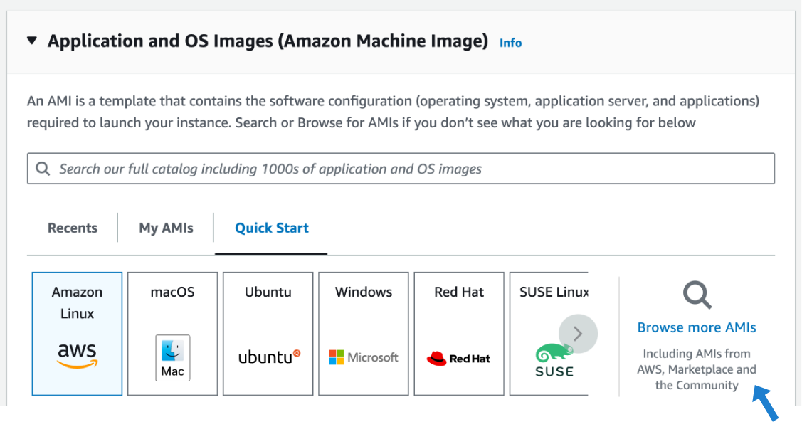 Under Application and OS Images, click Browse more AMIs: