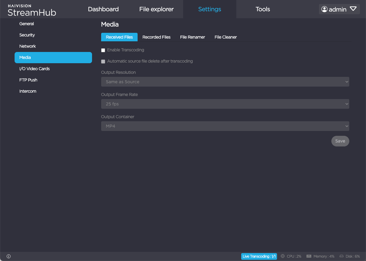 The Received Files and Recorded Files tabs allow you to automatically transcode all video files forwarded and recorded by field units. See Configuring the Media Transcoder for more details.