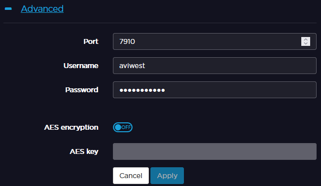 Click or to enable or disable the AES Encryption function. If enabled, enter the AES key as defined in the destination server interface (please refer to the Server User Guide).