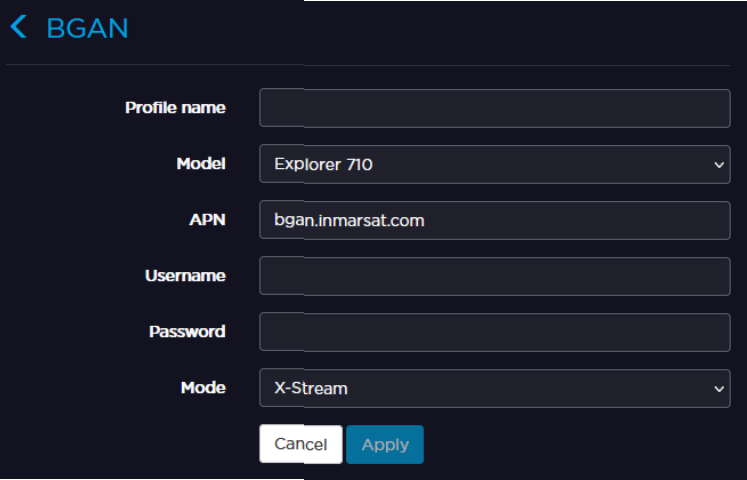 Fill in the settings: - Profile Name - Model: Hughes 9201, Hughes 9211, Explorer 710. - APN.