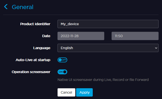 This option allows you to start a Live automatically once the unit is connected to a StreamHub or a Manager and once there is a video source (Pattern, SDI or HDMI).