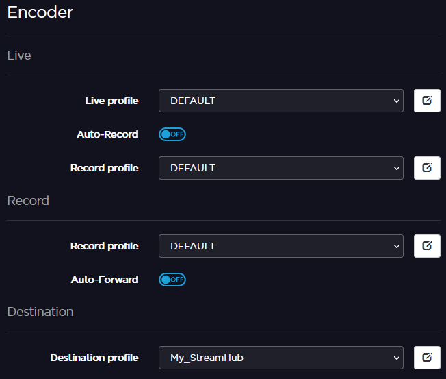 After setting a Destination Profile, you can configure a Live encoding using a Pattern and test communication between the unit and the destination StreamHub.