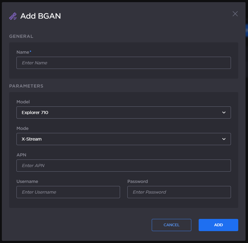 By default, the unit does not contain a Broadband Global Area Network (BGAN) profile. You must create and configure a BGAN profile before selecting it in a Live profile or a Forward configuration. See Configuring Live Profiles and Configuring Forward Settings.