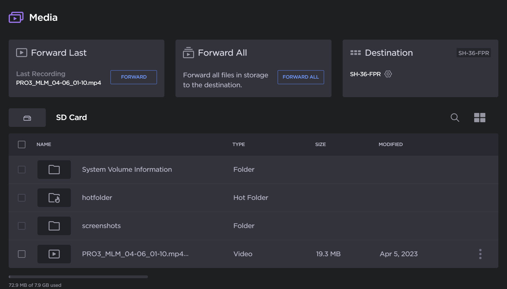 Select Media from the sidebar, the SD Card files will be listed on the Media page, as in the following example: