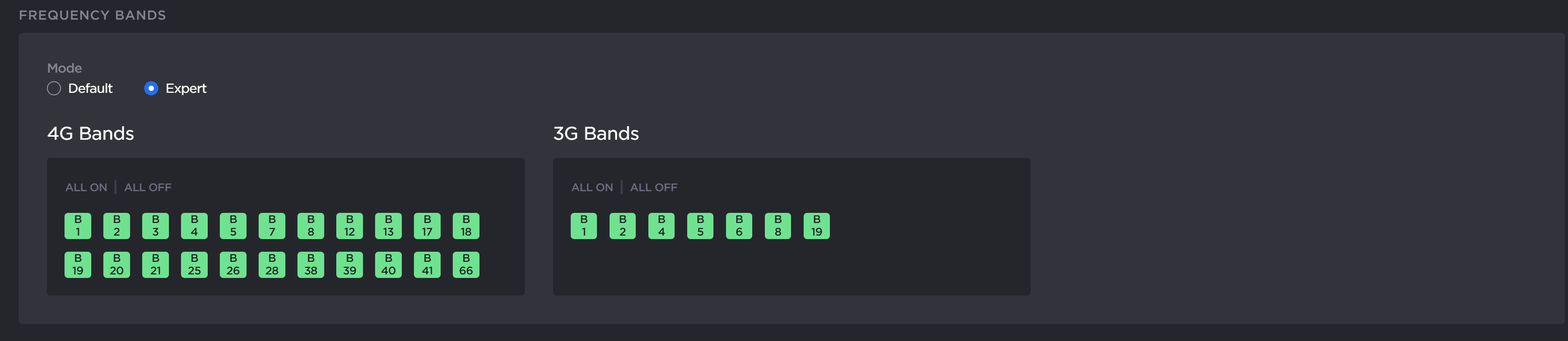 Click the All On and All Off buttons to enable/disable all frequencies within the respective 4G or 3G bands.
