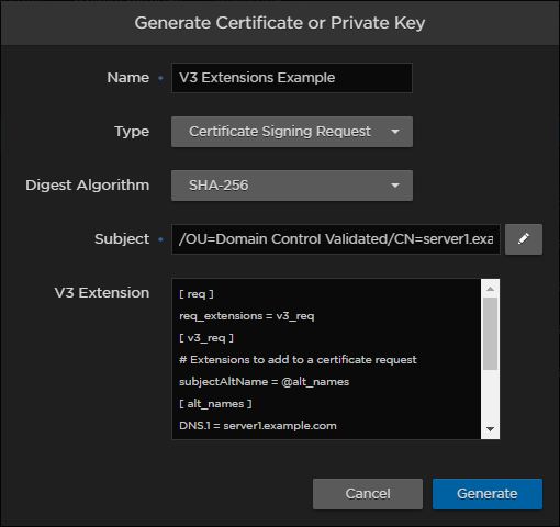 To add one or more SANs in the V3 Extension field, enter the same information that would go in the extensions section of an OpenSSL configuration file. For example: