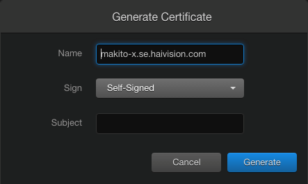 The Makito X Generate Certificates wizard has a Subject field where you can enter a Common Name. This wizard, appearing on both the encoder and decoder, executes a script that creates a copy of the OpenSSL configuration file (openssl.cnf), updates it with the parameters specified in the web panel, and then either generates a self-signed certificate or a certificate request (.csr).