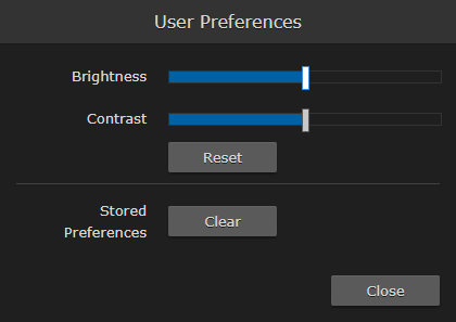 The User Preferences dialog allows you to set the brightness and contrast of the UI and clear your locally stored preferences.